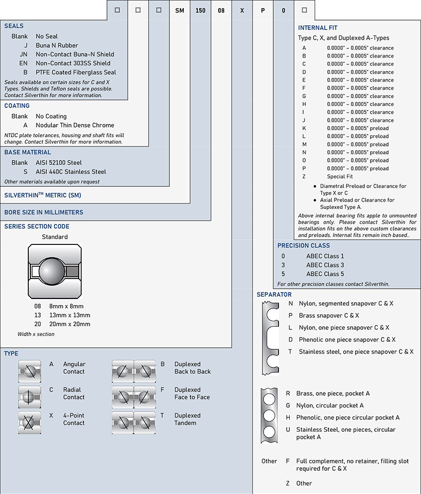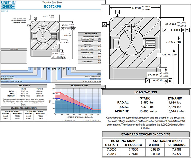 The Silverthin Datasheet Generator is a useful reference for bearing dimensional information, loading capacities, speed ratings and mating component dimensional guidelines. Generate a custom datasheet specific to any part number with any combinations of options or modifications.