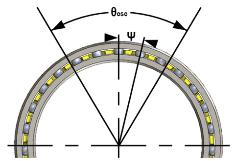Oscillating, or oscillatory, motion or rotation is the most straightforward to quantify and analyze. In the figure below, the Angle of Oscillation, θosc, represents the boundaries of the oscillating movement. It is recommended that θosc be at least 1.5X the ball spacing angle (Ψ) to limit the chance for false brinelling.